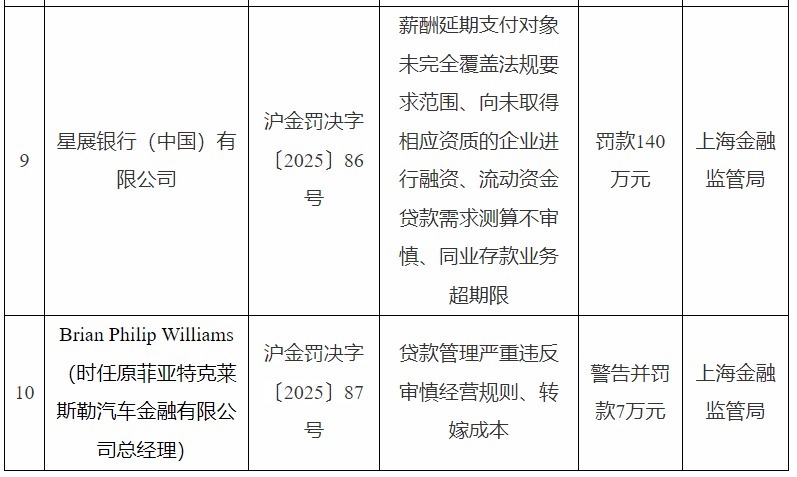 【大河财立方消息】2月24日,上海金融监管局披露的行政处罚信息显示,星展银行(中国)有限公司因薪酬延期支付对象未完全覆盖法规要求范围、向未取得相应资质的企业进行融资、流动资金贷款需求测算不审慎、同业存款业务超期限等,被罚140万元。